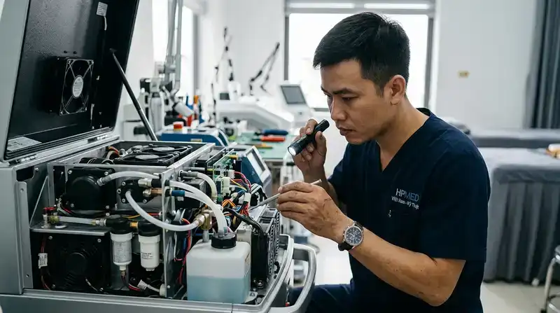 HPMED sở hữu hệ thống hỗ trợ toàn quốc với đội ngũ kỹ thuật am hiểu sâu về các thông số kỹ thuật khắt khe. Dù là máy triệt lông, giảm béo hay laser, kỹ thuật viên đều nắm vững cơ chế vận hành của từng dòng máy. Sự am hiểu này giúp việc chẩn đoán lỗi trở nên chính xác và nhanh chóng hơn bao giờ hết.